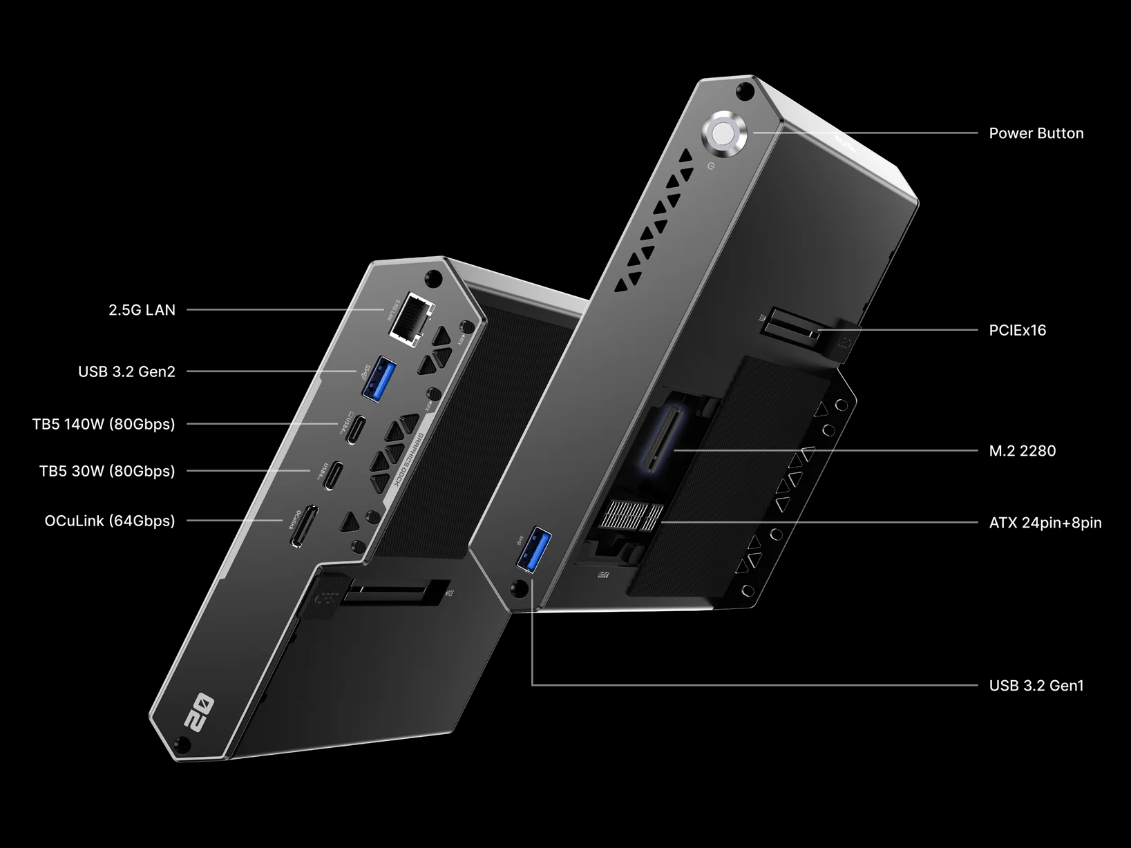 Por un lado, el DEG2 añade dos puertos Thunderbolt 5 sin sacrificar la conectividad OCuLink como el Peladn Link S-3. Según Minisforum, ambos puertos Thunderbolt 5 proporcionan un ancho de banda de 80 Gbps, pero con los mismos 64 Gbps que se ofrecen a las tarjetas gráficas a través de PCIe 4.0 x4 como OCuLink. Además, aunque uno de los puertos Thunderbolt 5 ofrece hasta 140 W de carga, el otro alcanza un pico de unos míseros 30 W.