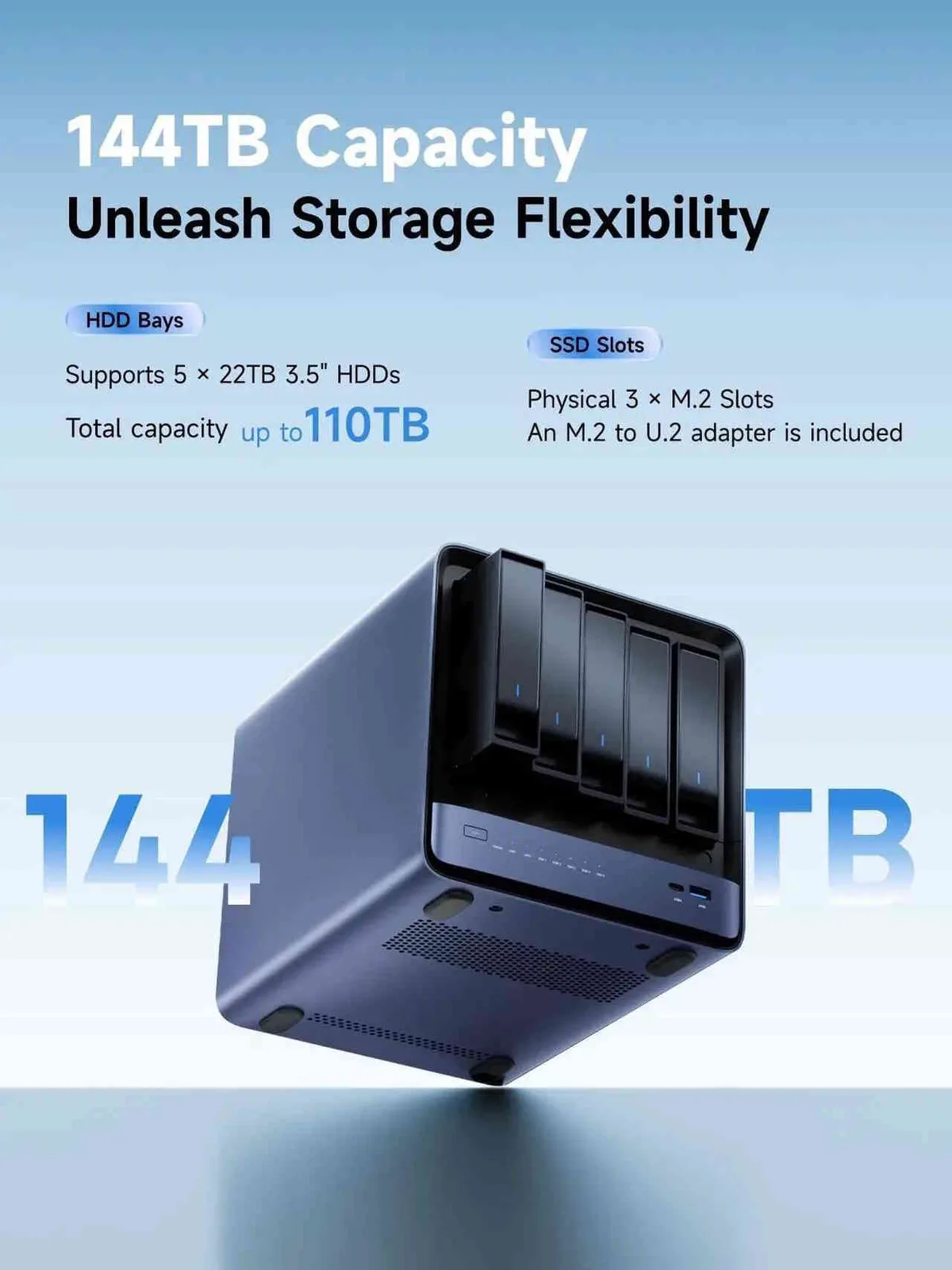 El Minisforum N5 Air ofrece cinco bahías para discos duros tradicionales y tres ranuras M.2 para unidades SSD NVMe. Un adaptador incluido permite a los usuarios instalar unidades U.2 en las ranuras M.2. La conectividad de red corre a cargo de dos puertos Ethernet de hasta 5 Gbit/s y 10 Gbit/s, respectivamente. El dispositivo NAS es compatible con Link Aggregation, aunque su hardware de red existente debe ser lo suficientemente rápido para evitar cuellos de botella significativos en otros puntos.