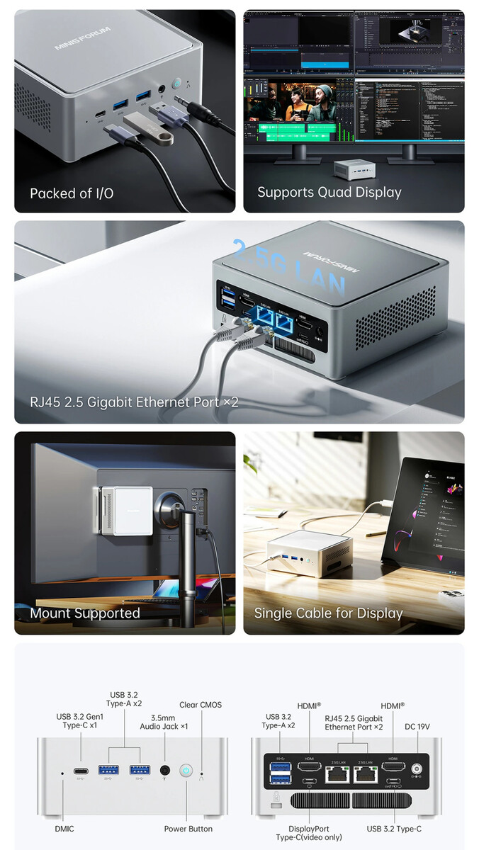 Además, el NAB3R admite almacenamiento y RAM ampliables, aunque sólo hasta 64 GB de DDR4-3200 en el caso de esta última. No obstante, Minisforum ha incluido una solución de refrigeración activa para la SSD M.2 2280 del mini PC, así como un gran ventilador turbo en su parte inferior. Como muestra la imagen inferior, al NAB3R tampoco le faltan puertos en su parte trasera.