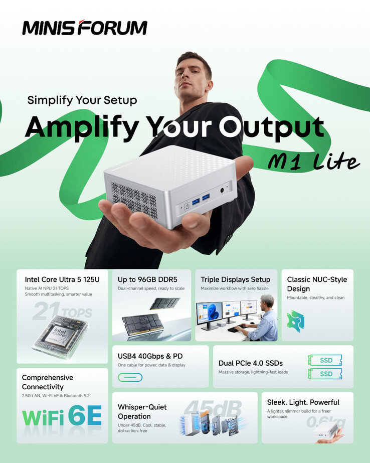 Un procesador de 12 núcleos, el Core Ultra 5 125U tiene un TDP de 35 W en el M1 Lite pero contiene una relativamente escasa iGPU de 4 núcleos. Afortunadamente, el M1 Lite también incluye un puerto USB4 para la expansión de la eGPU. Además, Minisforum equipa su nuevo mini PC con doble M.2 2280 y ranuras SODIMM que admiten hasta 96 GB de memoria RAM DDR5-5600.