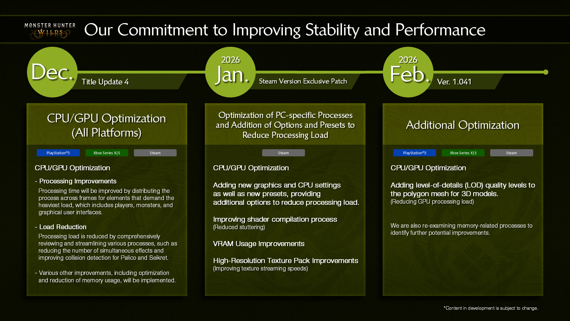Según las pruebas de Daniel Owen, los FPS mínimos han mejorado un 8% desde la actualización 4 del título y un enorme 20% desde la actualización 3. La razón por la que el rendimiento se ha visto afectado de esta forma en concreto parece ser las optimizaciones realizadas en la compilación de sombreadores y la transmisión de texturas. Junto con la corrección de errores, esto ha hecho que Wilds tenga un rendimiento de la CPU y una demanda de VRAM de la GPU drásticamente inferiores, que eran dos de los principales puntos débiles de la versión para PC.