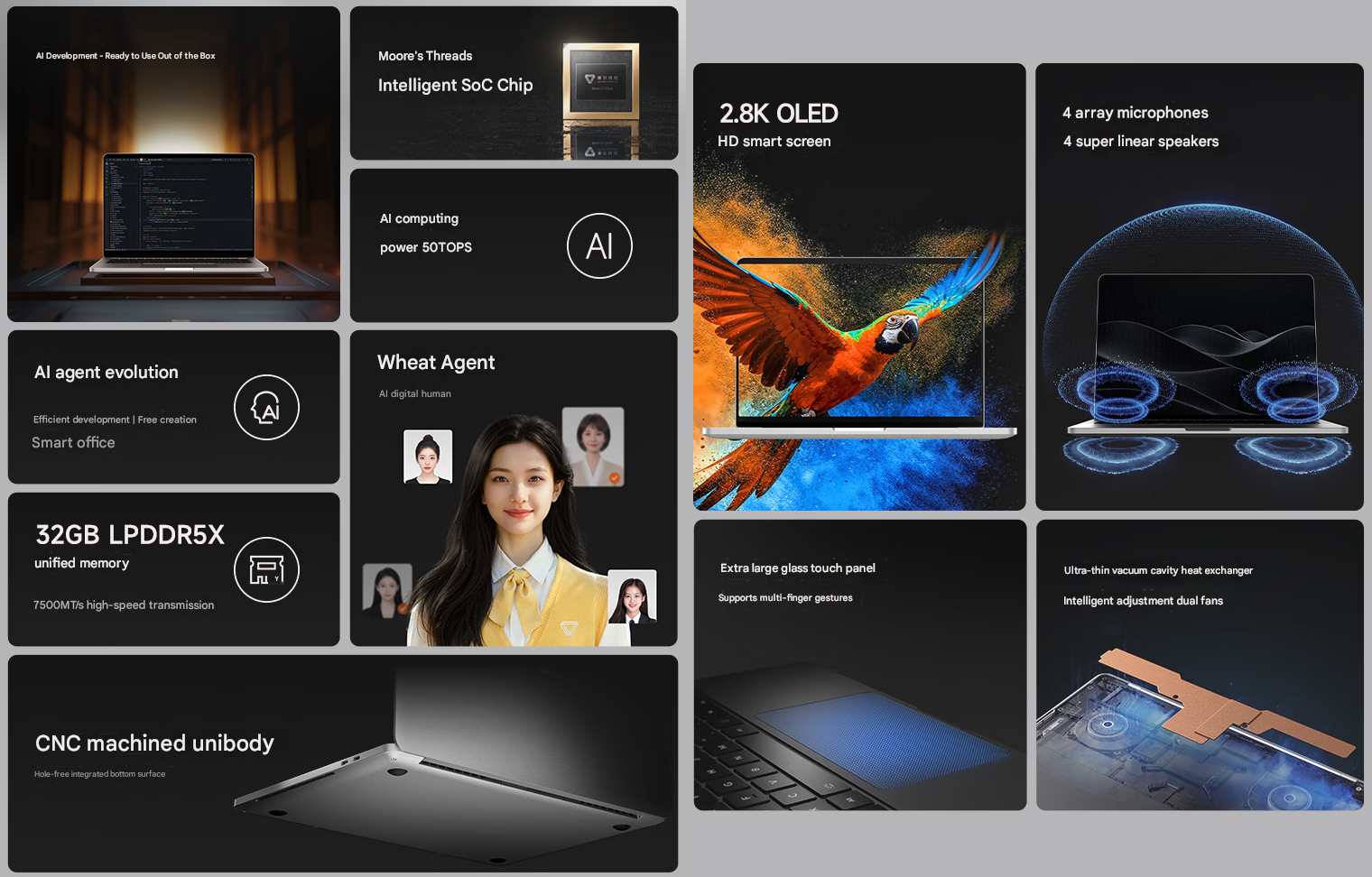 Parece que sólo hay una configuración del portátil, que empareja el SoC basado en ARM con 32 GB de RAM LPDDR5X. Aunque esta cantidad de memoria puede parecer un poco exagerada para un sistema que funciona con una pila de software propia, Moore Threads parece estar promocionando sus capacidades de IA.