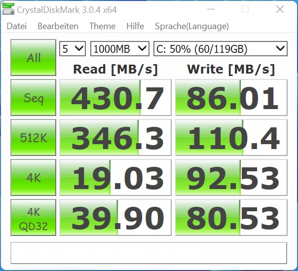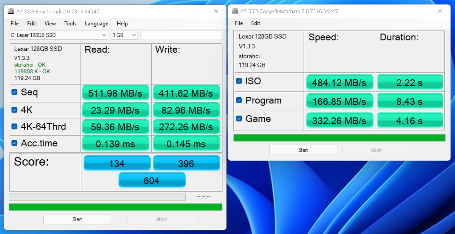 Dado que el Newsmay AC8 se ofrece como versión barebone, la configuración del almacenamiento masivo depende del comprador. Sin embargo, Newsmay Technology equipó el dispositivo con un SSD de 128 GB para nuestra revisión. Esto permite que el sistema funcione sin problemas y que se puedan ejecutar algunos programas junto con el sistema operativo. El SSD incorporado es un modelo M.2-2280 de Lexar, que sólo ofrece velocidades SATA. Esto también lo confirman las tasas de escritura y lectura secuenciales. Por desgracia, el Newsmay AC8 sólo puede equiparse con una unidad de almacenamiento masivo. Considerando el diseño, acomodar dos SSDs no debería ser un problema. No observamos ningún problema de temperatura en nuestro modelo