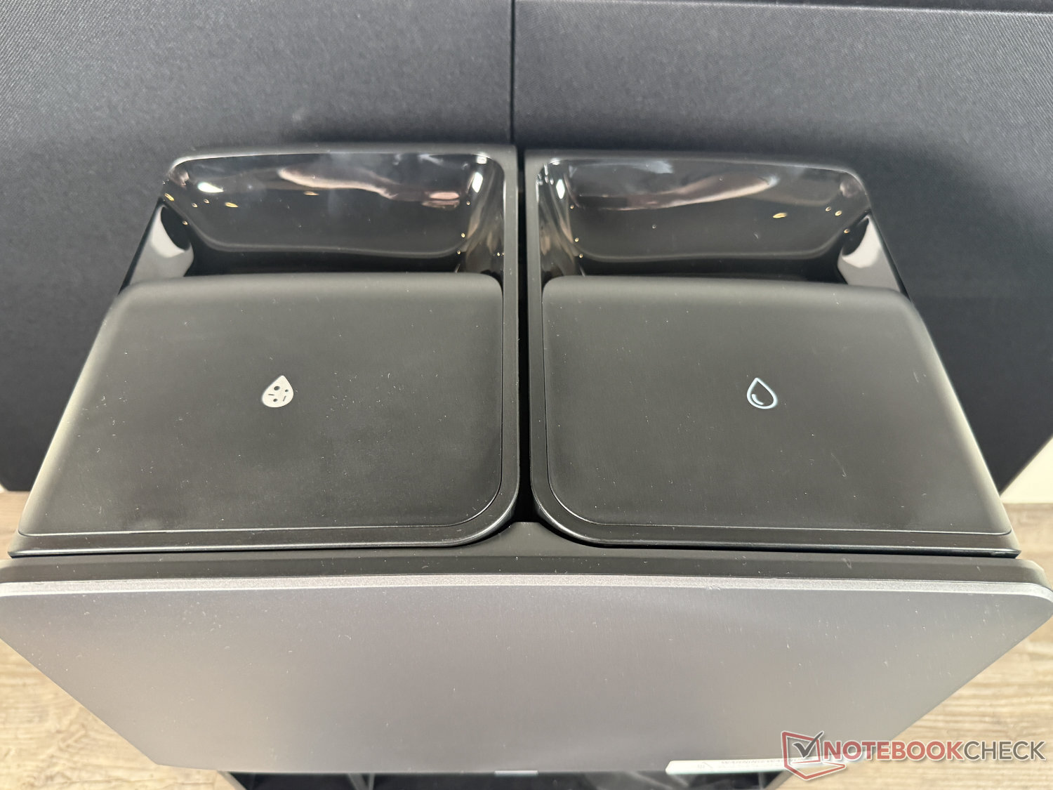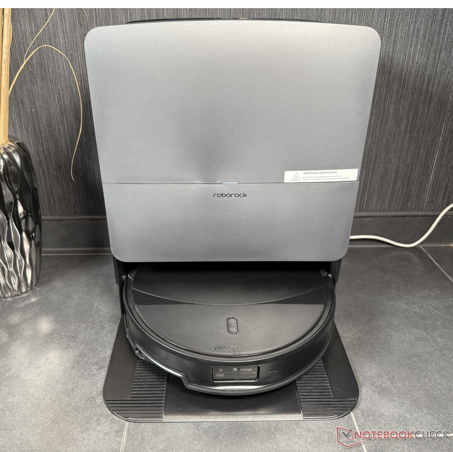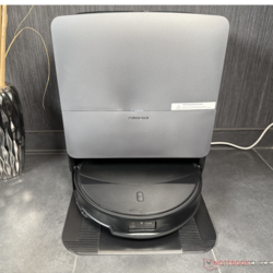 Hemos probado el set Saros 20. Como no se incluye ningún limpiador, no lo tuvimos en cuenta en nuestras pruebas de limpieza (a pesar de la opción de dosificación automática en la estación). Lo que nos lleva a la RockDock, la estación de limpieza de la Saros 20. Tiene un diseño muy similar a la Saros 10R, pero ahora puede limpiar las mopas y a sí misma con agua caliente a 100°C. A continuación, se seca con aire caliente a 55°C. Además del habitual autovaciado del contenedor de polvo en una bolsa de polvo (que ahora se seca con aire fresco), también se produce la mencionada dosificación de detergente y la carga en 2,5 horas.