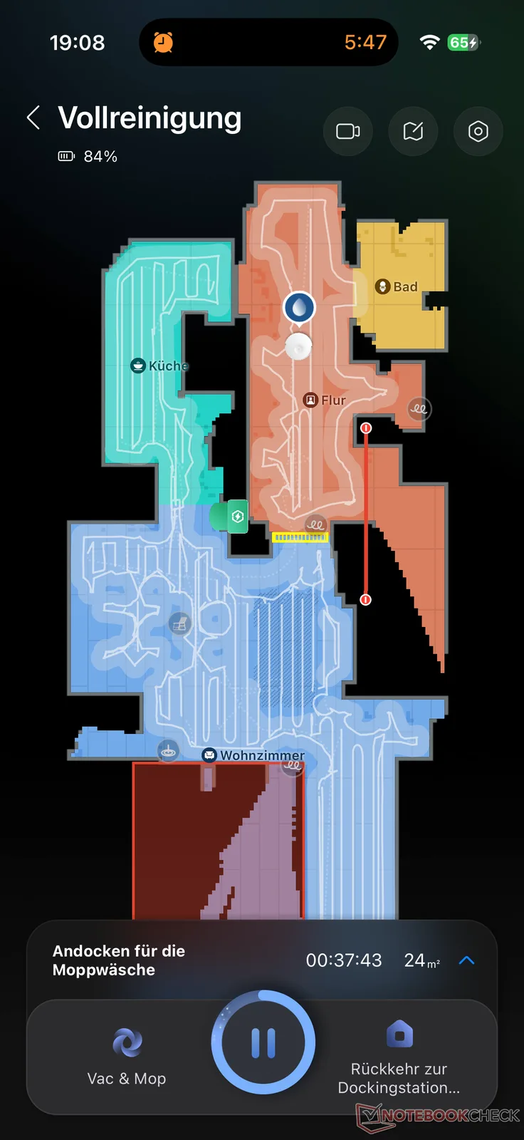Tras la puesta a punto sin problemas, durante la cual se toma al usuario de la mano, comienza la habitual carrera de mapeo. El reconocimiento automático de habitaciones funcionó bien en su mayor parte. Los retoques manuales, como los nombres individuales de las habitaciones o las zonas restringidas, se completan rápidamente. El robot aspirador y mopa estuvo listo para su uso al cabo de unos 10 minutos.
