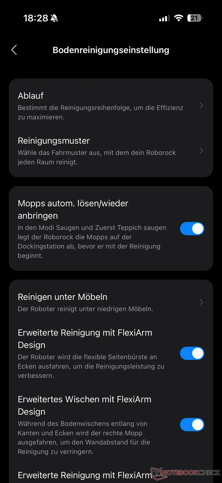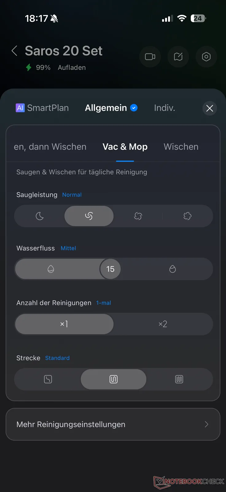 La aplicación Roborock ofrece cuatro opciones de limpieza para la Saros 20: "Aspirar y fregar", "Aspirar primero y fregar después" y "Sólo aspirar" y "Sólo fregar". Hay varias opciones disponibles para ambos modos de limpieza. Por ejemplo, la potencia de aspiración puede ajustarse en las cuatro etapas habituales y la humedad de la mopa en 30 etapas. AI SmartPlan también está disponible como alternativa a los modos. Aquí, el robot se adapta cada vez mejor a las condiciones, controlado por la IA.