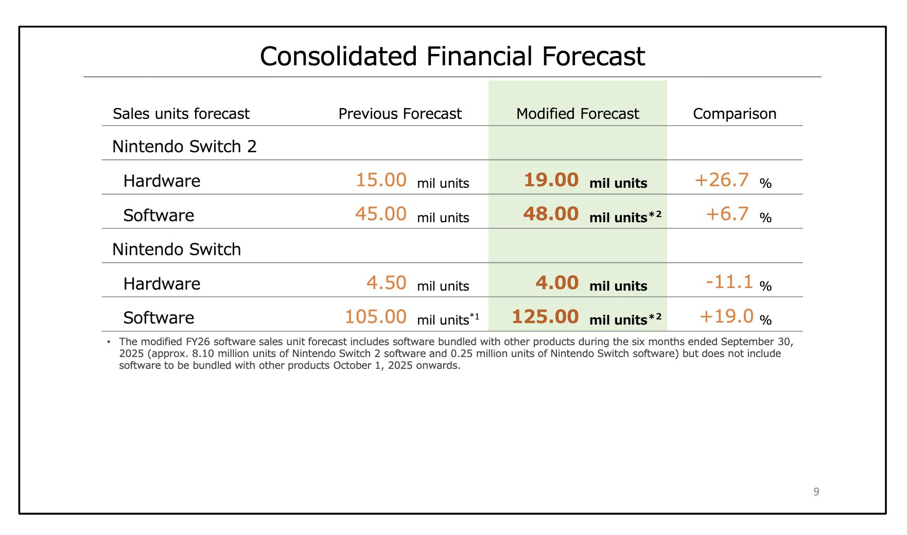 A estas alturas, Nintendo anticipa que la Switch 2 también será más popular que la Switch en su primer año, que alcanzó los 14,86 millones de unidades durante ese periodo. Como era de esperar, las ventas de esta última siguen cayendo, y Nintendo ha registrado un descenso interanual del 60%, hasta 1,89 millones de unidades. En consecuencia, Nintendo ha recortado su previsión de hardware para el modelo heredado a 4 millones de unidades, aunque las previsiones de software se han revisado al alza, de 105 millones a 125 millones, probablemente impulsadas por la retrocompatibilidad con los títulos de Switch 2 y porque Mario Kart World ya ha despachado 9,57 millones de unidades.
