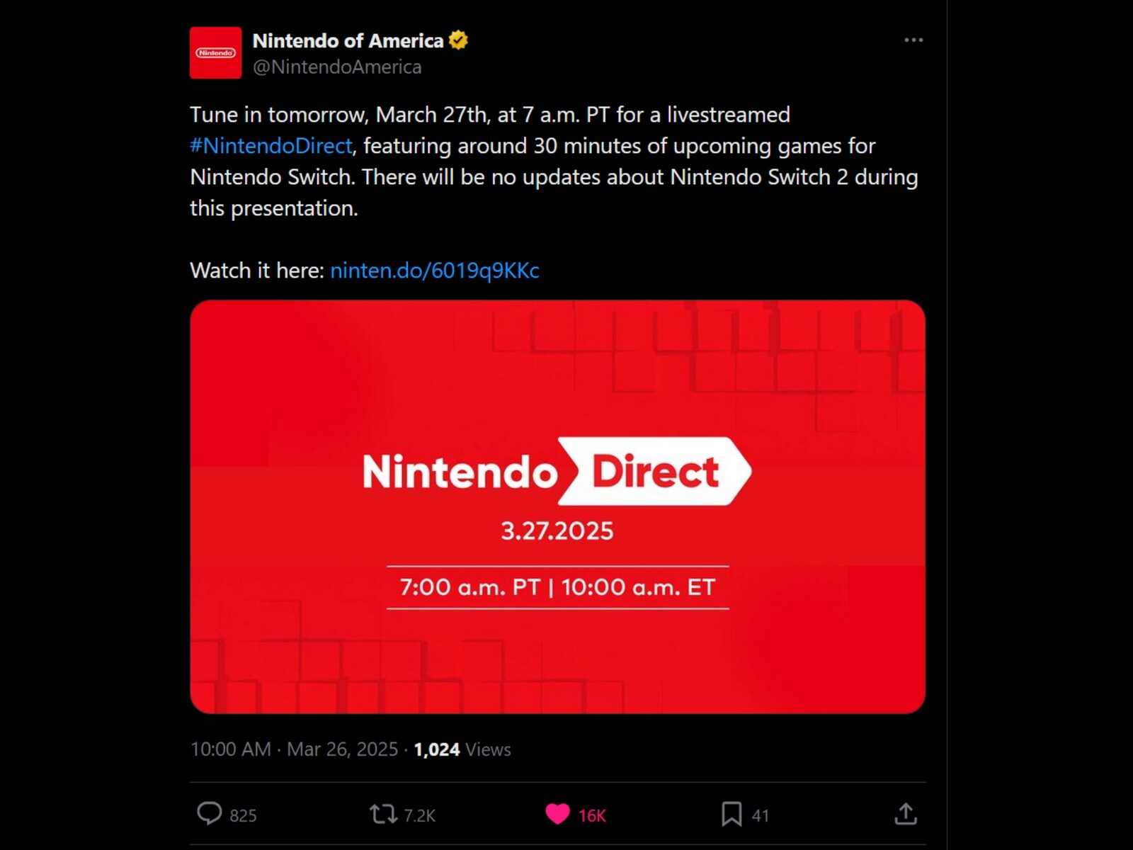 Muchos jugadores habían dudado de la oportunidad de una presentación una semana antes del Direct de Switch 2 del 2 de abril. Hubo rumores de un evento en febrero que finalmente no se materializó. Revelar detalles sobre el hardware de la consola o los títulos de lanzamiento podría robarle el protagonismo al espectáculo posterior. Sin embargo, el Nintendo Direct del 27 de marzo tratará, al parecer, de una acumulación de títulos de la actual generación sin anunciar. Las ventas de la actual Switch se han ralentizado con el lanzamiento de pocos títulos nuevos de alto perfil.
