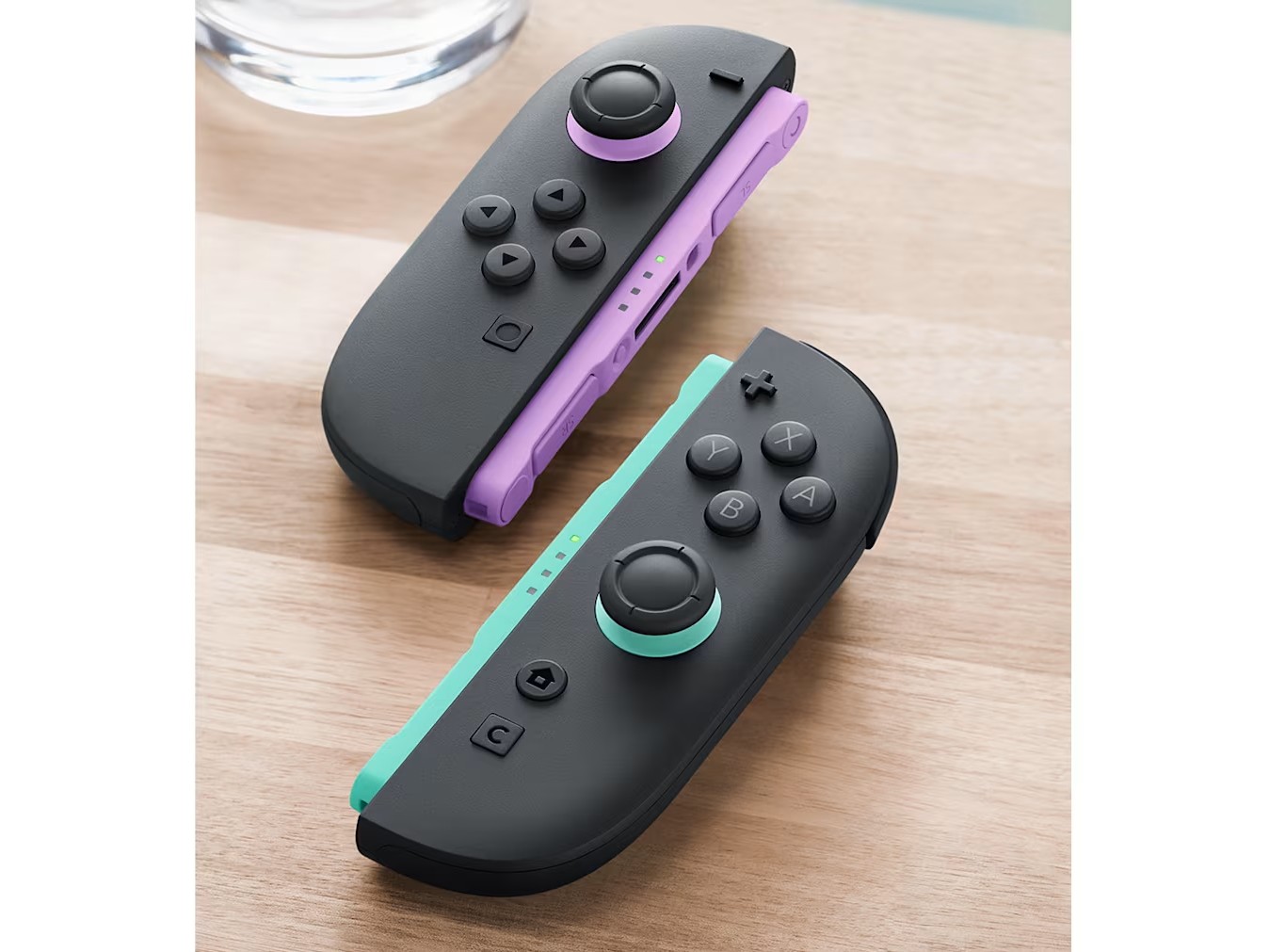 Al igual que los Joy-Con azules y rojos originales de Switch 2, el nuevo conjunto está acabado en su mayor parte en negro, con detalles en morado claro y verde claro en los anillos de los joysticks y en los raíles laterales. Los colores apenas son visibles cuando se colocan, pero los acentos pastel en los joysticks siguen creando un sutil contraste contra la carcasa más oscura, al tiempo que mantienen la sobriedad del diseño general. Los nuevos tonos también parecen más suaves y apagados que los Joy-Con originales.