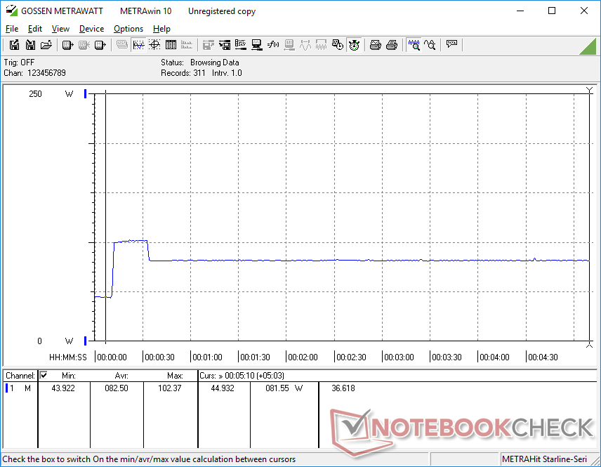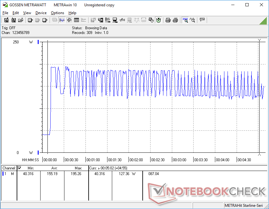 Podemos medir un consumo máximo de 195 W del adaptador de CA pequeño-mediano (~15,8 x 6,5 x 2,5 cm) de 200 W cuando se ejecuta tanto Prime95 como FurMark simultáneamente. A diferencia de lo que observamos en los modelos Blade 15 RTX, sin embargo, el consumo fluctuaría entre 127 W y 190 W en lugar de mantenerse estable como se muestra a continuación. La velocidad de recarga se ralentizará hasta el punto de arrastrarse cuando se den estas condiciones de procesamiento extremas.