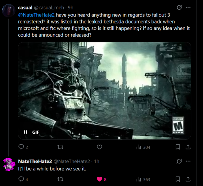 Los documentos de la adquisición por parte de Microsoft también hacían referencia a un Elder Scrolls IV: Oblivion remaster. El anuncio oficial de esa versión parece inminente, pues ya se han filtrado capturas de pantalla. Por otro lado, el proyecto Fallout 3 sigue en el limbo, según el post X de NateTheHate. Respondiendo a una pregunta de un ansioso jugador, el insider dijo: "Pasará un tiempo antes de que lo veamos"
