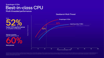 - En Geekbench 6.2 monohilo, el Snapdragon X Elite es un 54% más rápido que el Core Ultra 7 155H con el mismo consumo de energía (potencia ISO) o es un 65% más eficiente. El Snapdragon X Elite supera al Intel Core 9 185H en un 51% con el mismo consumo de energía o consume un 65% menos de energía.
