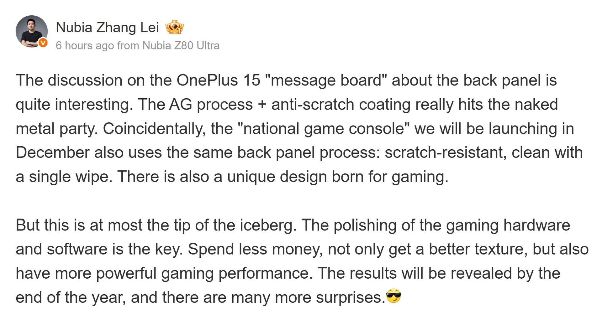 Zhang añade que Nubia está trabajando en un teléfono asequible para juegos que utilizará la misma tecnología de panel trasero. Lo que es más importante es que el director general de Nubia afirma que será más adecuado que el OnePlus 15 (chino de 256 GB con un precio actual de 693,54 dólares en TradingShenzhen) para los jugadores, ya que vendrá con optimizaciones tanto de software como de hardware para juegos.
