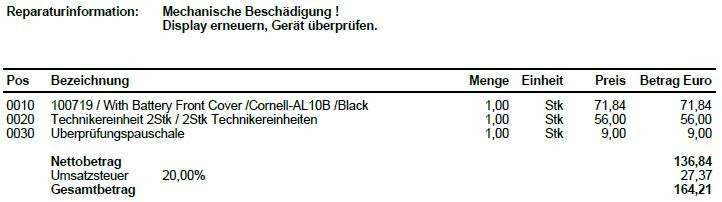 El miércoles 19 de junio recibimos por correo el presupuesto de reparación prometido. La reparación de la pantalla costaría exactamente 164.21 Euros (~$183.02). Mientras que esto excedía ligeramente la cantidad verbalmente establecida, todavía estaba dentro de nuestro presupuesto de pruebas. Inmediatamente acordamos los honorarios y se hizo un pedido de reparación vinculante, o eso creímos.