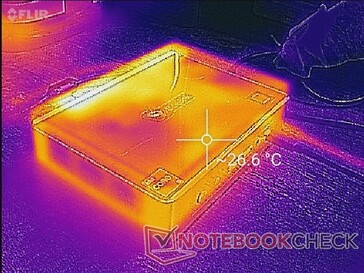 Las temperaturas superficiales no son un problema en el GTI 11. De hecho, cualquier diferencia entre el ralentí y las cargas de juego es bastante menor, como muestran nuestros mapas de temperatura a continuación. El aire frío entra por los dos lados del chasis más alejados y el aire caliente sale por la parte trasera. Se pueden colocar objetos encima de la unidad sin obstruir el flujo de aire, pero una orientación vertical puede afectar al ruido del ventilador o a la temperatura.
