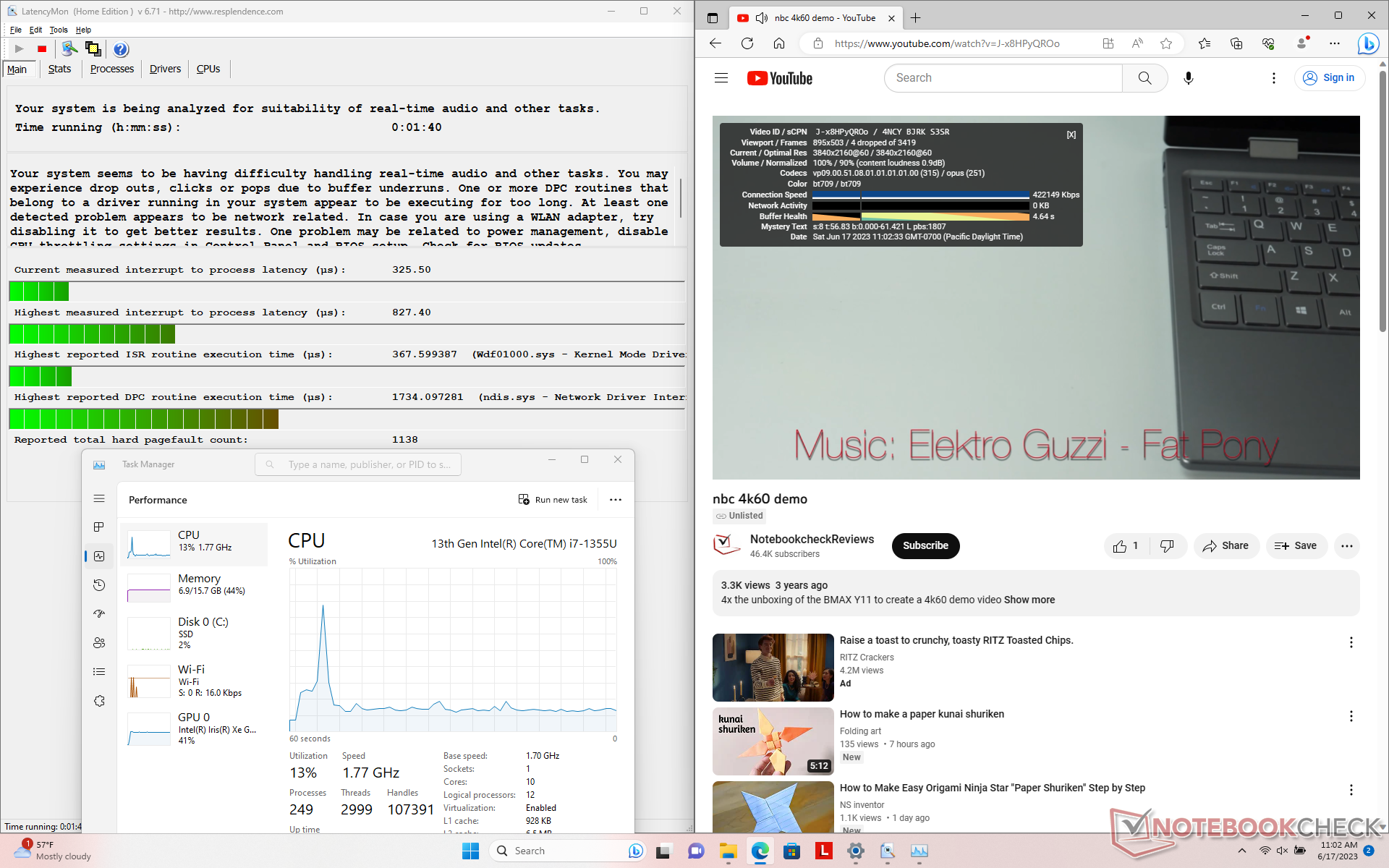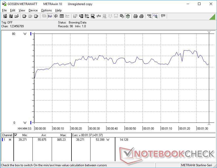 Al iniciar el estrés Prime95, la CPU aumentaría a 4 GHz y 53 W durante sólo un segundo o así antes de acercarse a una temperatura del núcleo de 100 C. A partir de entonces, las velocidades de reloj, el consumo de energía de la placa y la temperatura finalmente comenzarían a oscilar entre 1,4 y 3,5 GHz, 13 y 44 W, y 74 y 100 C, respectivamente. Este comportamiento es diferente al de la mayoría de portátiles Core serie U, donde las velocidades de reloj y temperaturas más estables son mucho más comunes.