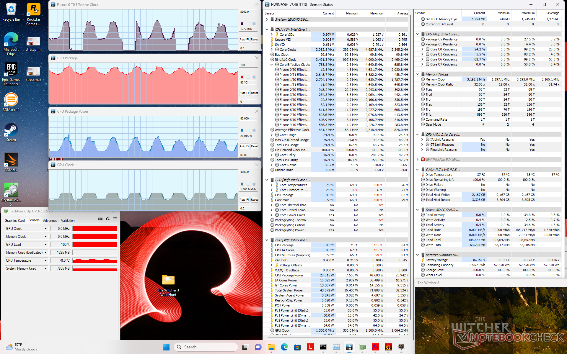 Cuando se ejecuta Witcher 3las frecuencias de reloj y la temperatura de la GPU oscilan entre 800 y 1300 MHz y 73 y 91 C, respectivamente. Este comportamiento cíclico conduce a velocidades de fotogramas inestables cuando se juega como se ejemplifica en nuestro Witcher 3 gráfico anterior.