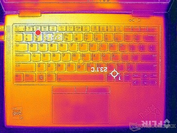La mitad izquierda del portátil siempre estará más caliente que la derecha debido a la colocación de la solución de refrigeración en su interior. Los puntos calientes pueden alcanzar hasta 42 C y 46 C en la parte superior e inferior, respectivamente, en comparación con 40 C en ambos lados del Dell Latitude 9430 2 en 1.