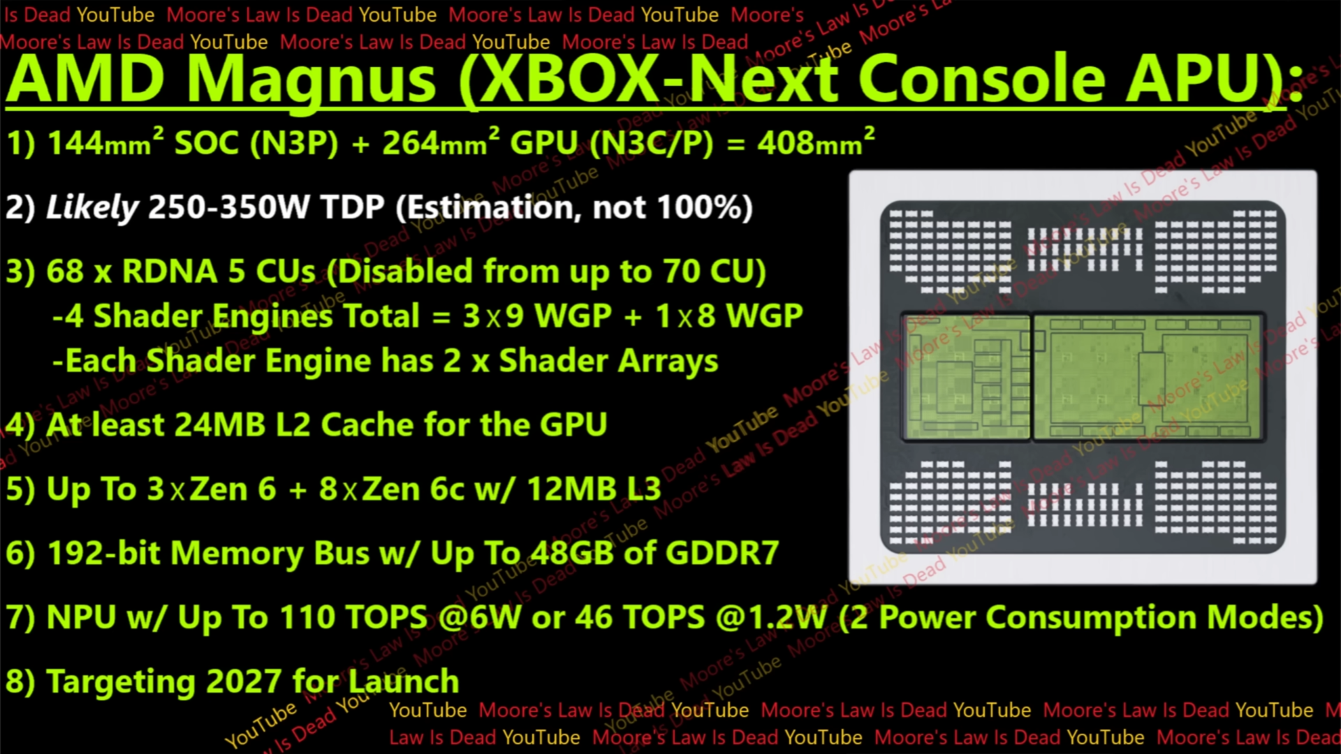 Su GPU se fabricará en el nodo N3P o N3C de TSMC, mientras que su SoC estará en el N3P de TSMC. En cuanto a la CPU, vendrá con una de 11 núcleos con tres núcleos Zen 6 y ocho núcleos Zen 6c. Tom afirma que la cifra es provisional y que algunos de ellos podrían desactivarse. Por último, la Xbox Magnus también vendrá con una NPU para tareas de IA en el dispositivo.