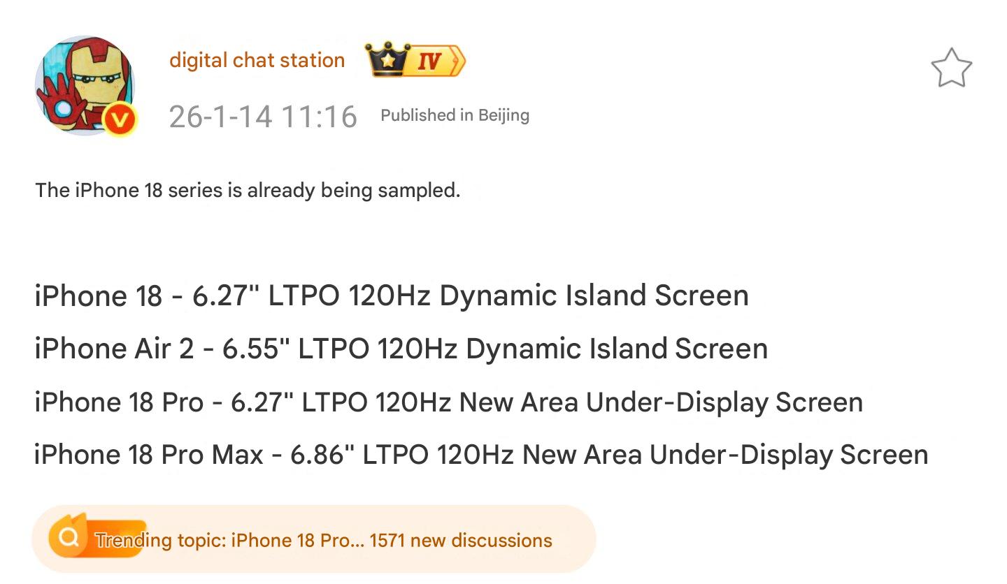 Según la información revelada por Digital Chat Station en Weibo, y traducida por Ice Universe en X, el iPhone 18, el iPhone 18 Pro, el iPhone 18 Pro Max y el iPhone Air 2 contarán con pantallas OLED LTPO de 120 Hz. En cuanto a las dimensiones y la configuración de Face ID, el DCS afirma: