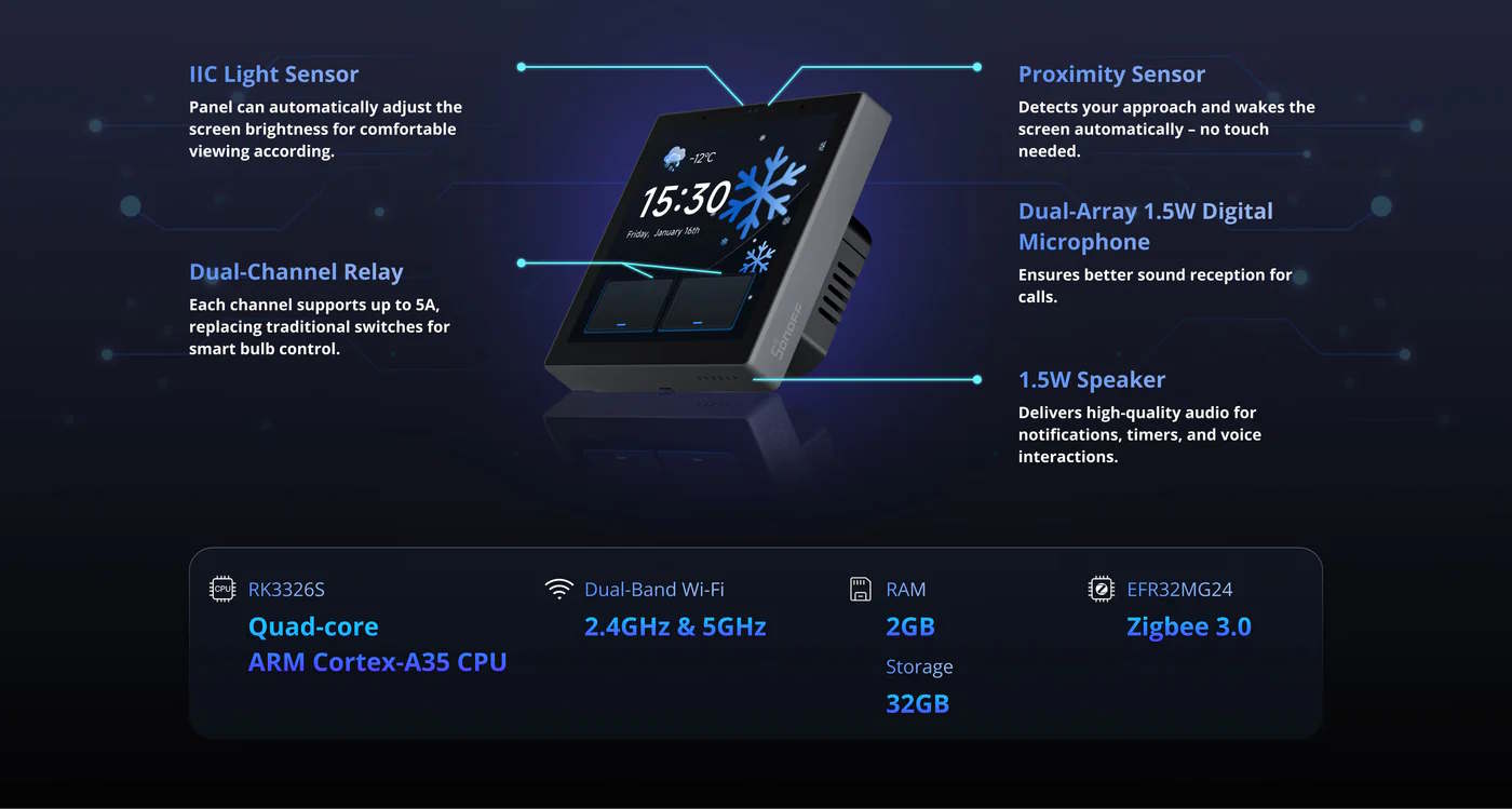 El hardware incluye dos micrófonos para comandos de voz. El SoC RK3326-S está emparejado con 2 GB de RAM y 32 GB de almacenamiento interno. La pantalla de 3,95 pulgadas tiene una resolución de 480 × 480 píxeles y es táctil. Su brillo también se puede controlar mediante un sensor de luminosidad, por lo que sigue siendo fácil de leer durante el día y no distrae por la noche. El NSPanel Pro Gen 2 puede detectar cuando una persona está de pie delante del dispositivo. Incorpora un altavoz. También se dice que puede mostrar imágenes de cámaras de vigilancia. El modelo está actualmente disponible para pedidos por unos 120 dólares, y se espera que los envíos comiencen en junio.