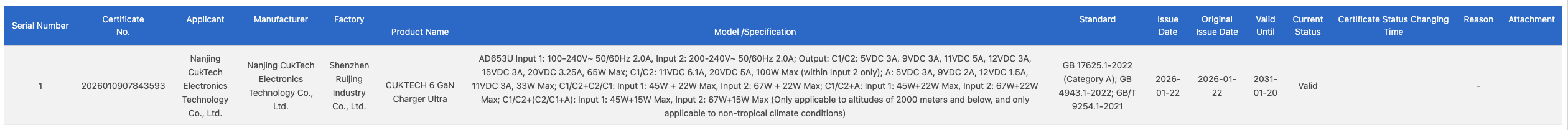 Ahora, el Cuktech 6 GaN Charger Ultra ha aparecido en la base de datos del Centro de Certificación de Calidad de China (CQC) https://webdata.cqccms.com.cn/webdata/query/CCCCerti.do. La entrada indica que este accesorio sin estrenar ha conseguido la certificación CCC (China Compulsory Certification) o 3C. Esta página también revela algunas de las características de este producto.