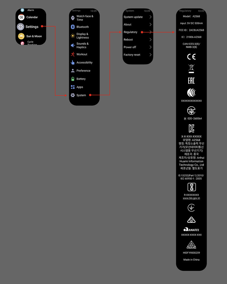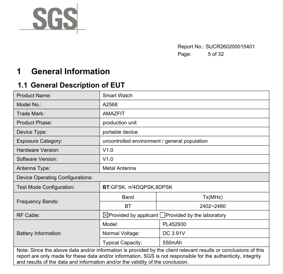 Por ejemplo, el Amazfit A2568 contiene una batería de 550 mAh. Más de un 60% mayor que la batería de 340 mAh del Bip 6, esta capacidad probablemente impide que el A2568 sea el Bip 7. Lo mismo ocurre con el Active 2 Square, cuya batería es más de un 50% menor que la del A2568.