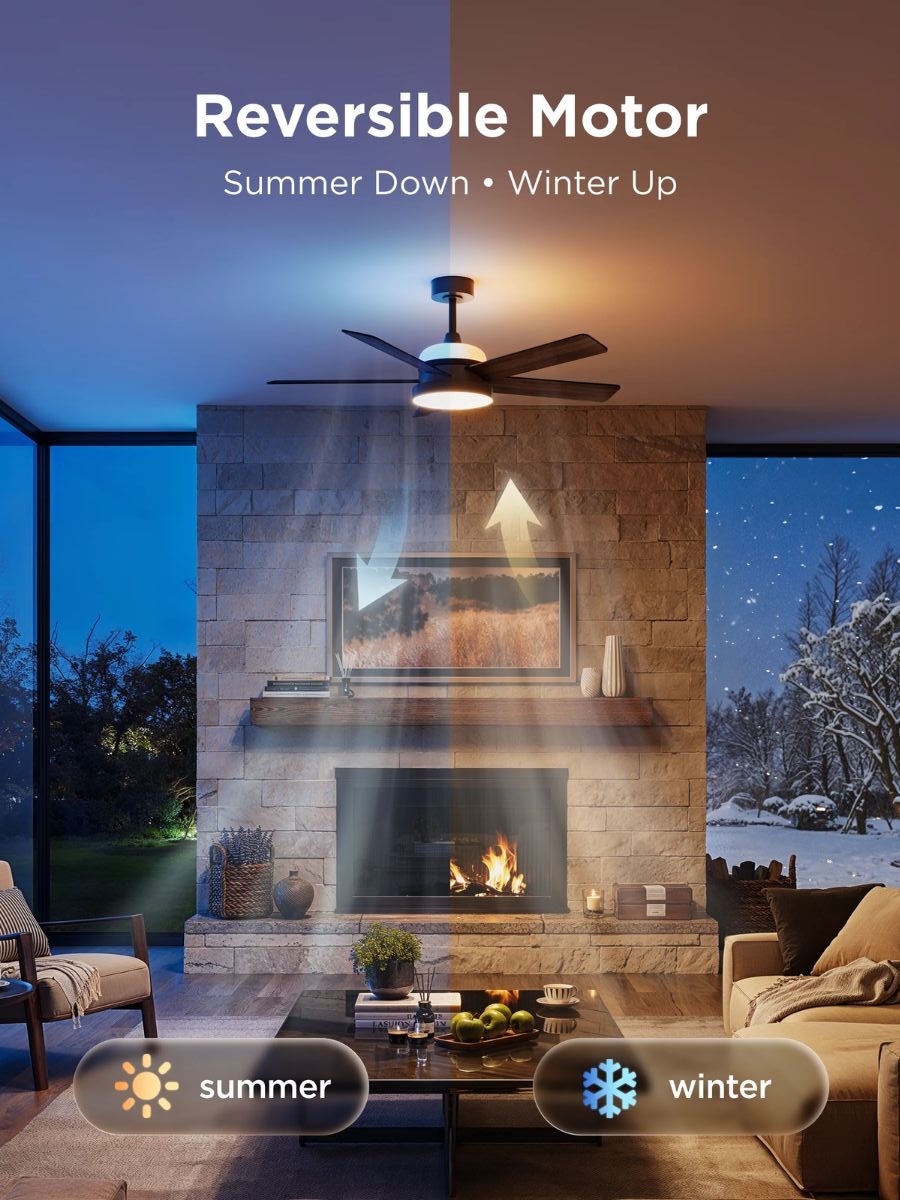 Se dice que este ventilador de techo de Govee enfría rápidamente una habitación, con un caudal de aire de hasta 142 m³/min (5.000 pies³/min). Los usuarios pueden elegir entre seis ajustes de velocidad, y puede funcionar de forma relativamente silenciosa, ya que el motor genera unos 30 dB de ruido. Además, el motor reversible permite extraer el calor hacia arriba y hacerlo circular por la habitación en invierno.