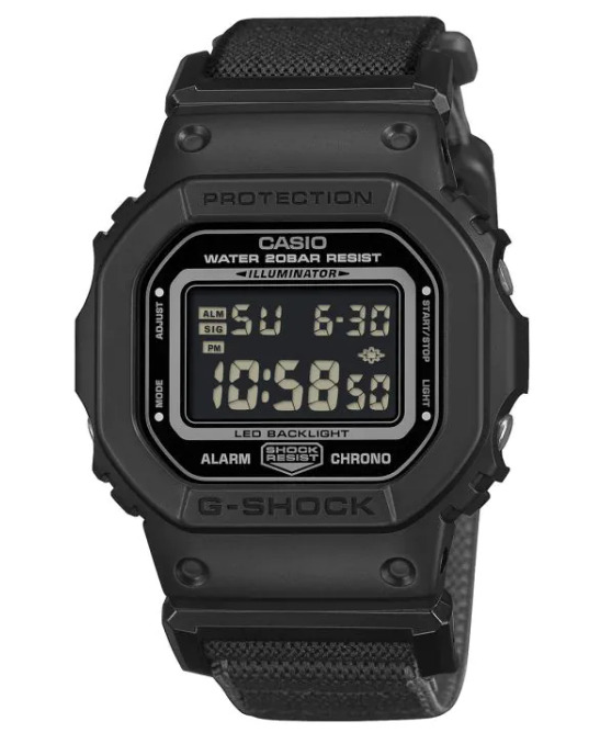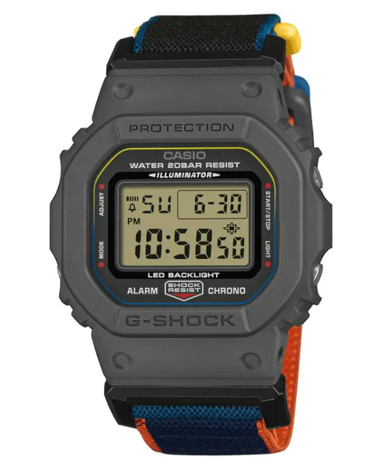 Lo que hace única a esta próxima serie son las correas. En lugar de la habitual correa de resina, los modelos DW-5600MNC incorporan una correa cruzada de tela. La tela parece estar hecha a capas, con una textura visible y revestimientos interiores en contraste. En una variante de color gris claro (DW-5600MNC-7A8), la correa muestra un acento interior amarillo brillante que asoma por los bordes superior e inferior. La versión en negro (DW-5600MNC-1) tiene un aspecto más discreto con una banda de tela oscura a juego. Otro modelo, el DW-5600MNC-BA2, utiliza una caja oscura con una correa multicolor, con acentos azules y naranjas en los laterales. Aunque no se ha confirmado información detallada sobre el material, las bandas parecen ser más gruesas que las correas de nailon estándar.