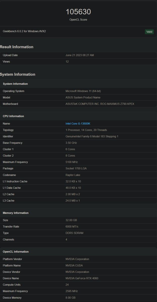 Obtiene una puntuación de 105.630 en la prueba comparativa OpenCL de Geekbenchlo que la hace un 18% más rápida que la GeForce RTX 3060 (89.000). Las cosas no son muy diferentes en Vulkandonde la GeForce RTX 4060 obtiene 99.419 puntos, lo que la hace un 17% más rápida que su predecesora. También confirma algunas especificaciones de GeForce RTX 4060, como 24 SMs (Streaming Multiprocessors) y 8 GB de memoria GDDR6.