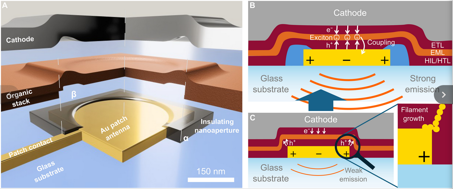 Los investigadores alemanes publicaron sus hallazgos en la revista Science Advances, donde señalan que el píxel de 300 nm² emite luz naranja y es tan brillante como un OLED convencional de 5 nm². Sin embargo, encoger simplemente el diodo emisor de luz no permitiría obtener una eficacia fiable. Los científicos necesitaban implantar una antena cuboide de oro de 300 x 300 x 50 nm y también tenían que asegurarse de que las corrientes del campo eléctrico no forzaran a los átomos de oro a ramificarse en el material ópticamente activo y provocar finalmente un cortocircuito en toda la estructura del píxel. Para ello, los investigadores diseñaron una capa aislante sobre la antena, que deja una abertura circular de 200 nm de diámetro en el centro de la misma.