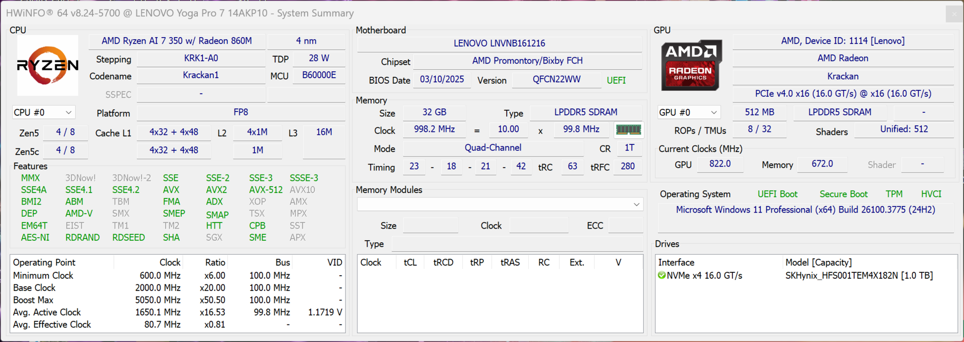| Lenovo Yoga Pro 7 14AKP G10 Ryzen AI 7 350, Radeon 860M, SK hynix PVC10 HFS001TEM4X182N, OLED, 2944x1840, 14.5" | Acer Swift 14 AI SF14-51-58TU Core Ultra 5 226V, Arc 130V, Micron 2550 512GB, OLED, 2880x1800, 14" | Schenker XMG Evo 14 (M24) R7 8845HS, Radeon 780M, Samsung 990 Pro 1 TB, IPS, 2880x1800, 14" | Asus VivoBook S 14 OLED M5406WA Ryzen AI 9 HX 370, Radeon 890M, Micron 2400 MTFDKBA1T0QFM, OLED, 1920x1200, 14" | Xiaomi RedmiBook Pro 14 2025 Ultra 7 255H, Arc 140T, YMTC PC411-1TB, IPS, 2880x1800, 14" | Lenovo Yoga Pro 7 14ASP G9 Ryzen AI 9 365, Radeon 880M, Micron 2550 1TB MTFDKCD1T0TGE, OLED, 3072x1920, 14.5" | |
