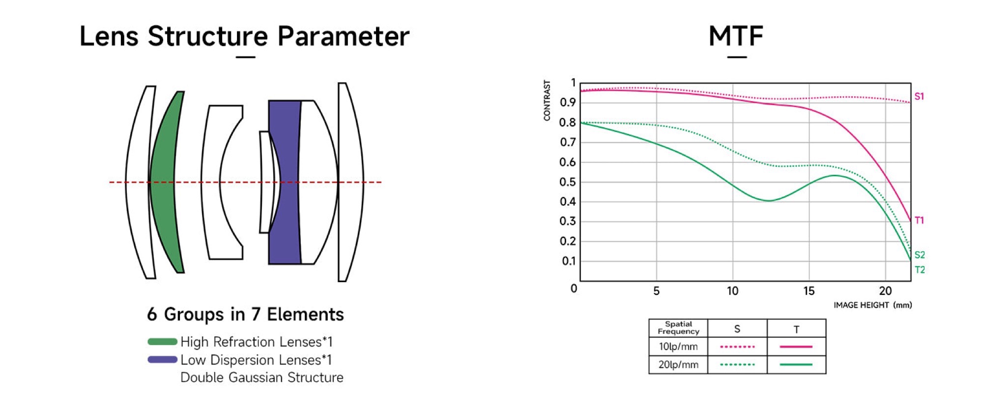 Para hacer posible su bajo precio, Brightin Star opta por una construcción de objetivo relativamente sencilla con 7 elementos en 6 grupos y renuncia por completo a las lentes asféricas o con corrección apocromática. Como muestran las curvas MTF del fabricante, el objetivo ofrece muy pocos detalles en los bordes del encuadre a máxima abertura. El objetivo sólo es nítido en el centro de la imagen, lo que debería hacerlo adecuado para retratos, entre otros escenarios.