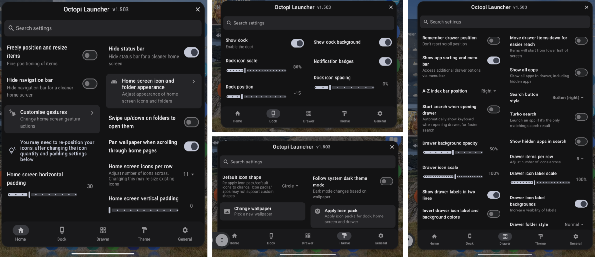 Lanzador Octopi rectifica esto permitiéndole establecer diseños completamente independientes. No sólo para las pantallas interior y exterior, sino también para las orientaciones horizontal y vertical. También resulta ser uno de los lanzadores más personalizables y ligeros, junto con Lawnchair, Niagra, y el ya desaparecido Nova.