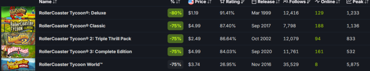 El título inicial de 1999, RollerCoaster Tycoon Deluxe, cuesta actualmente 1,19 dólares. Sigue manteniendo su calificación de "abrumadoramente positivo", con un 94% de críticas positivas. El juego registró un pico de 422 jugadores simultáneos en los últimos 30 días. Su secuela, RollerCoaster Tycoon 2: Triple Thrill Pack, tiene un precio de 2,49 $ y debería ser excelente para quienes utilicen el moderno motor OpenRCT2, impulsado por la comunidad.