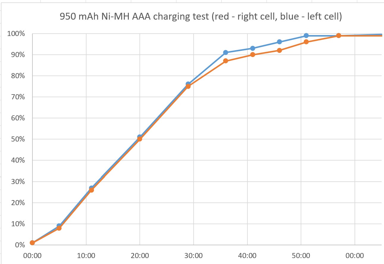 La velocidad de carga de los pares AA fue notablemente desigual, con una celda cargándose más rápido que la otra. Al cargar pares, la máquina no expulsará la celda que haya terminado primero. Las pilas cargadas estaban ligeramente calientes al tacto.