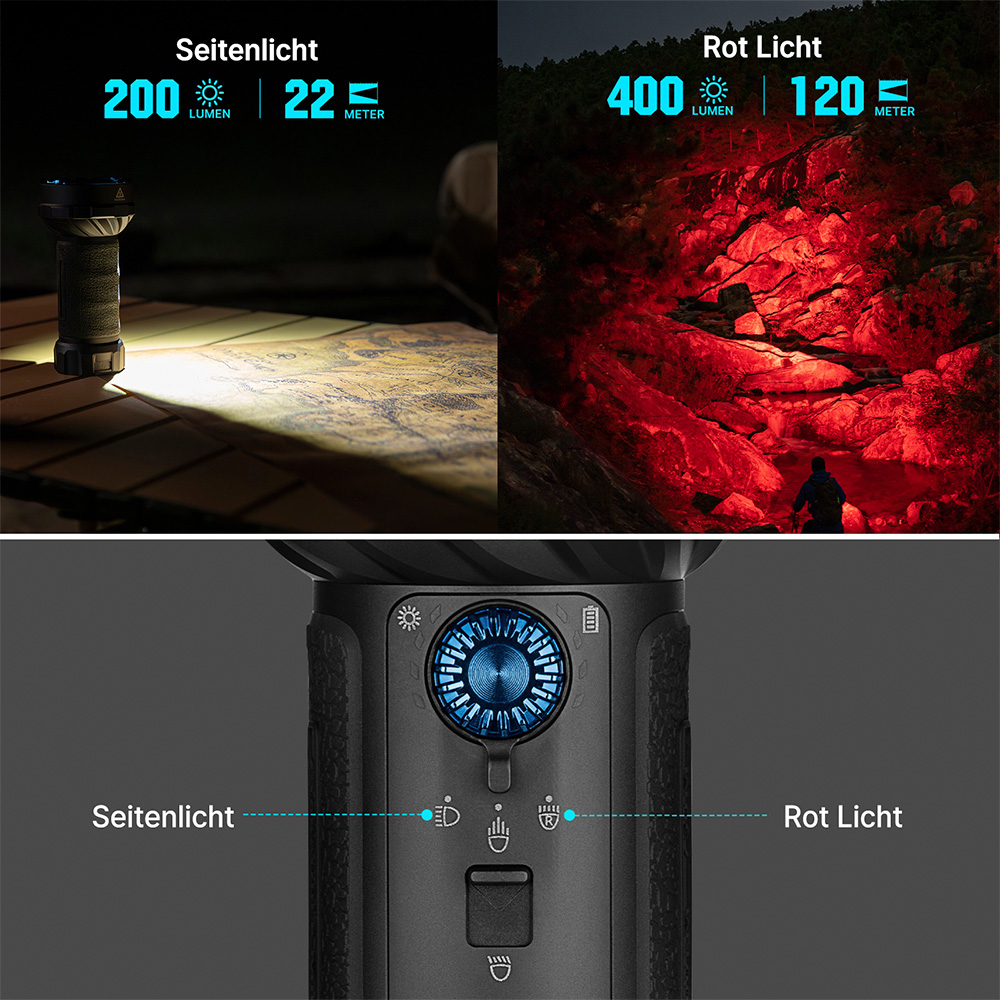 La linterna dispone de varios controles, como un dial giratorio, un interruptor selector en el dial que se desliza lateralmente y un interruptor deslizante que controla la luz de inundación, la luz puntual y el modo combinado. Este último no funciona cuando la luz roja o la luz lateral están encendidas. El dial giratorio también actúa como botón de encendido.