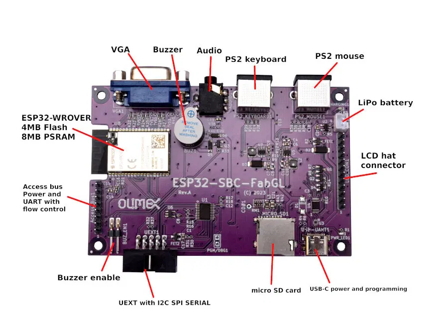 Como referencia, FabGL es compatible con varios emuladores, incluidos los de CPU Intel 8080 y 8086. Por lo tanto, el ESP32-SBC-FabGL es adecuado para ejecutar DOS, entre otros casos de uso. Además, el SBC cuenta con un zumbador, un lector de tarjetas microSD y un puerto USB Tipo-C para programación y alimentación. Por otra parte, Olimex ha incluido un puerto VGA, un conector LCD hat y un conector de batería LiPo.