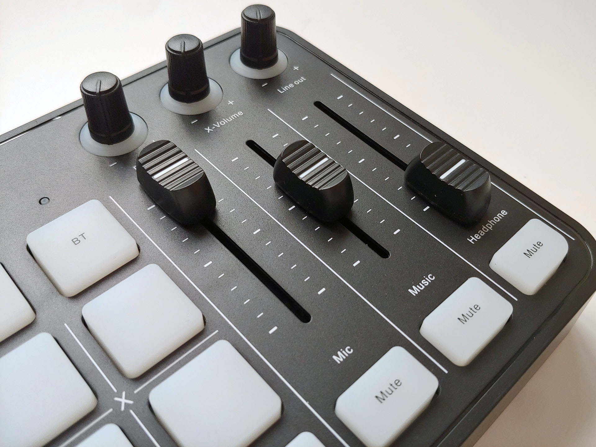 Los deslizadores son bastante suaves, pero requieren un tacto más firme en comparación con las mesas de mezclas profesionales para ajustar simultáneamente los tres de forma suave con una sola mano. El deslizador de micrófono sólo controla el volumen de las entradas combinadas de micrófono XLR y de auriculares, por lo que la única forma de equilibrar la sonoridad de dos altavoces es mover los micrófonos.