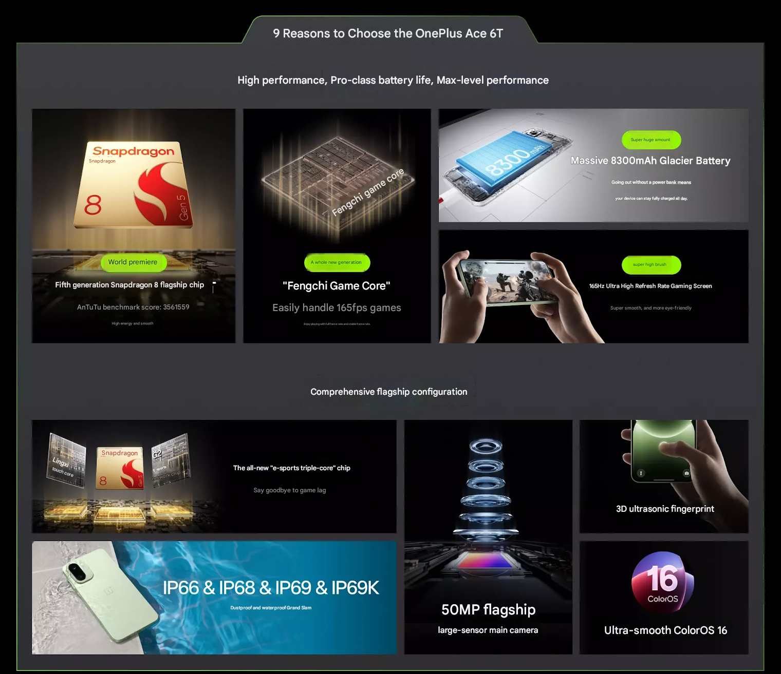 Otros aspectos destacados del teléfono incluyen una configuración de doble cámara en la parte trasera con un sensor primario de 50 MP, hasta 16 GB de RAM LPDDR5X y 1 TB de almacenamiento UFS 4.1, y compatibilidad con WiFi 7. En China, el Ace 6T tiene un precio inicial de preventa de 2.599 CNY, unos 367 $. El teléfono se lanzará como el OnePlus 15R en el mercado global el 17 de diciembre de.