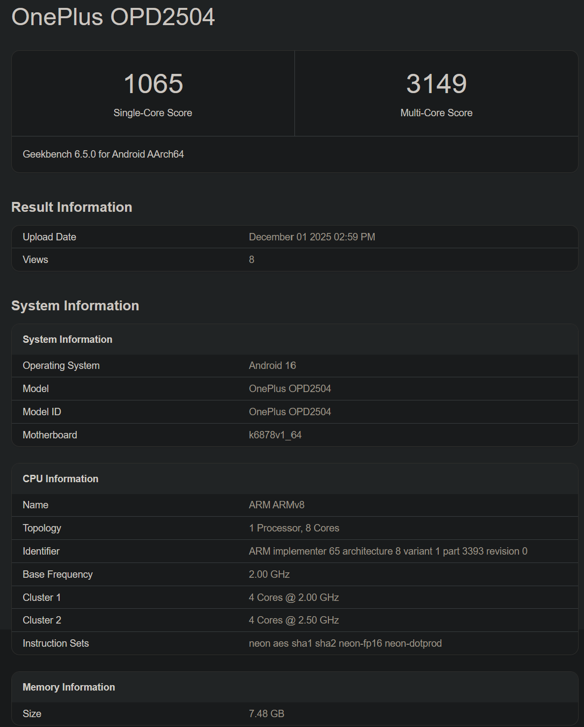 Llega con la etiqueta OnePlus OPD2504 y lo que parece un MediaTek Dimensity 7300 SoC con cuatro núcleos P a 2,5 GHz, cuatro núcleos E a 2,0 GHz, una GPU Arm Mali-G615 MC2 y 8 GB de memoria de sistema. Obtiene puntuaciones de 1065 y 3149 en las pruebas mononúcleo y multinúcleo de Geekbench, lo que está a la par con la puntuación media del Dimensity 7300.