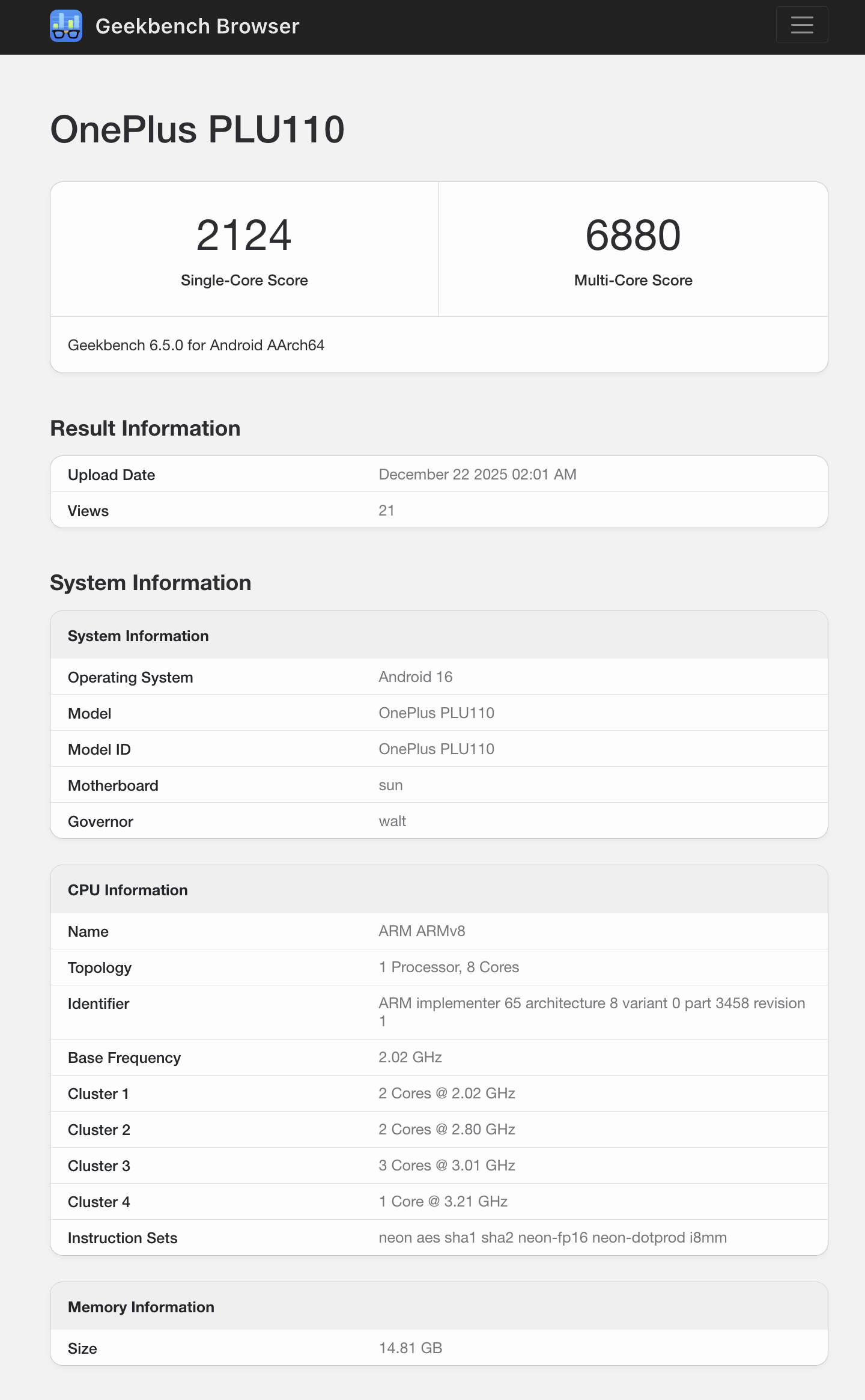 OnePlus oficialmente confirmó la existencia de su nueva serie de smartphones Turbo la semana pasada. Aunque la compañía ha mantenido sus cartas cerca de su pecho desde entonces, nuevas entradas de Geekbench parecen haber revelado varios detalles antes de tiempo. Como muestran las capturas de pantalla que aparecen a continuación, un smartphone OnePlus inédito con el número de modelo PLU110 ha aparecido ahora en la popular plataforma de evaluación comparativa.