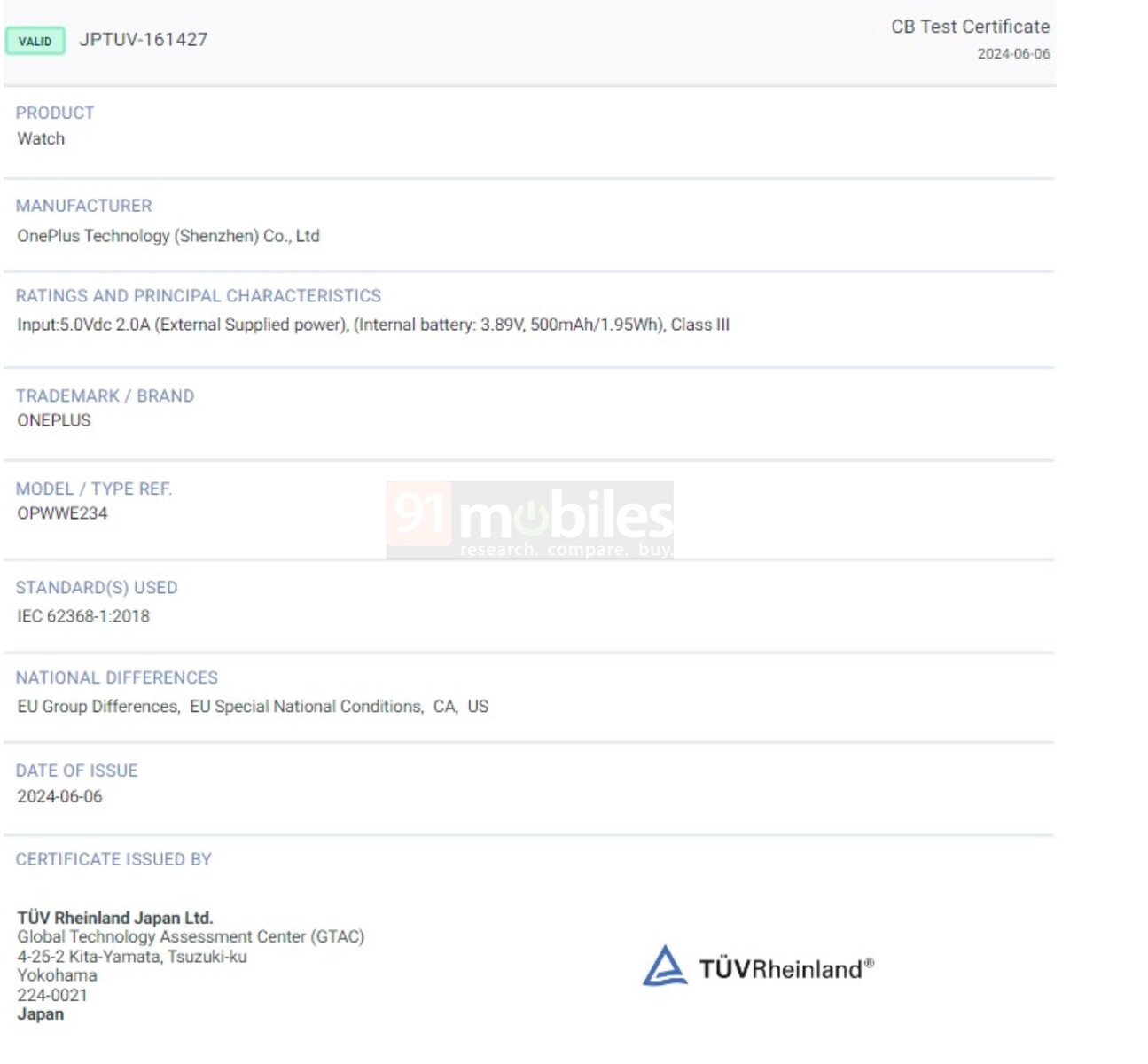 No obstante, OnePlus ha certificado lo que parece ser el OnePlus Watch 3 para su venta tanto con el Bureau of Indian Standard (BIS) como con el TÜV Rheinland. Concretamente, ambos informan de que OnePlus ha certificado el "OPWWE234", que este último confirma que se trata de un smartwatch. Como referencia, aunque ninguno de los dos confirma el nombre comercial del dispositivo, su número de modelo es idéntico al del OnePlus Watch 2al que OnePlus asignó el número de modelo 'OPWWE231'.
