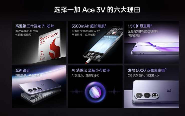 Como referencia, la gran pantalla funciona a 1.240 x 2.772 píxeles, 2.150 nits y 120 Hz con modos de 60 Hz y 90 Hz. Mientras tanto, el Ace 3V cuenta con una cámara principal de 50 MP (IMX 882), una frontal de 16 MP y una ultra gran angular de 8 MP, de las cuales sólo la principal está estabilizada ópticamente. Actualmente, se espera que el Ace 3V se lance globalmente como el Nord 4, aunque OnePlus sólo ha confirmado la existencia del de aspecto similar Nord CE 4 hasta el momento. En cualquier caso, el Ace 3V se presenta en las opciones de color Magic Purple Silver y Titanium Air Grey con las siguientes configuraciones de memoria:
