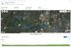 Durante nuestro paseo en bicicleta requerido, el smartphone de Oppo mostró algunas desviaciones significativas en comparación con el dispositivo de referencia Garmin Edge 500 en largas carreteras rectas. Sin embargo, las curvas se registraron comparativamente bien. En general, el Oppo A73 5G sólo es adecuado para tareas de navegación muy simples.