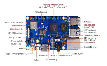 Como tal, la Orange Pi 3B posee cuatro núcleos de CPU ARM Cortex-A55 a 1,8 GHz, una GPU ARM Mali-G52 2EE y un acelerador de IA que ofrece hasta 1 TOPS de rendimiento. Shenzen Xunlong Software complementa el chipset con memoria RAM LPDDR4 o LPDDR4X, según la configuración elegida, además de ranuras eMMC, MicroSD y M.2 Key M (PCIe 2.0). Como referencia, la Orange Pi 3B se entrega con los siguientes puertos: