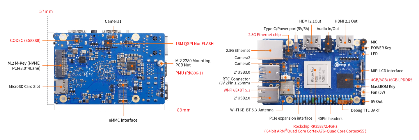 Parece que la nueva variante "Max" es en realidad una versión reducida de la Orange Pi 5 Plus que ya tiene más de un año. En concreto, Shenzhen Xunlong Software equipa el Orange Pi 5 Max con un chipset Rockchip RK3588, además de 4 GB, 8 GB o 16 GB de RAM LPDDR5 y varias opciones de almacenamiento como una ranura M.2 2280 (PCIe 3.0 x4) y un zócalo eMMC. Además, el ordenador monoplaca (SBC) integra un par de puertos HDMI 2.1 que soportan hasta 8K/60 Hz, un cabezal GPIO de 40 pines y una conexión Ethernet Gigabit de 2,5 en una placa de 96 x 57 mm.