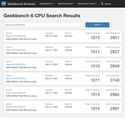 Como siempre, Geekbench no se refiere al teléfono por su nombre. No obstante, tanto el '23122PCD1G' como el 'granate' han aparecido recientemente en línea y vinculados al nombre del modelo POCO X6 5G. Según Kacper Skrzypek, estos detalles relacionan el POCO X6 5G con el Redmi Note 13 Proque se espera que reciba un lanzamiento europeo propio en breve. Para ello, la versión global del Redmi Note 13 Pro llegó a Geekbench el mes pasado como '2312DRA50G', un hermano directo del '2312DRA50C' que Xiaomi vende en China como elRedmi Note 13 Pro.