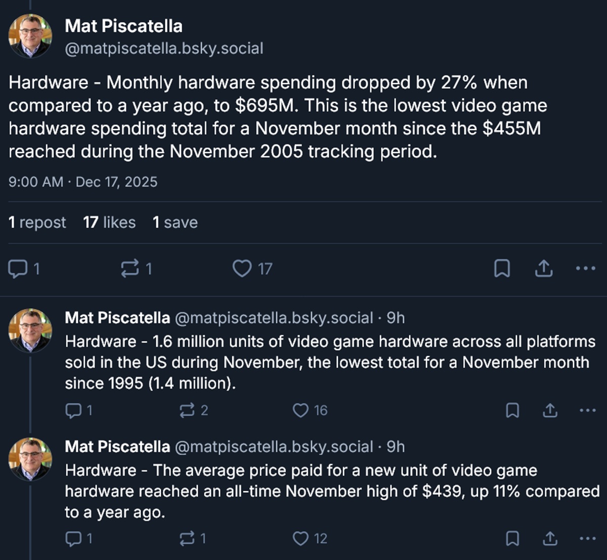 Puede que Sony celebre el informe Circana, pero hay señales de advertencia para el mercado del hardware. Las ventas totales descendieron un 27% en comparación con el mismo periodo de 2024. El gasto alcanzó los 695 millones de dólares, el total de noviembre más bajo desde 2005. Los minoristas vendieron 1,6 millones de unidades, el peor resultado desde noviembre de 1995.