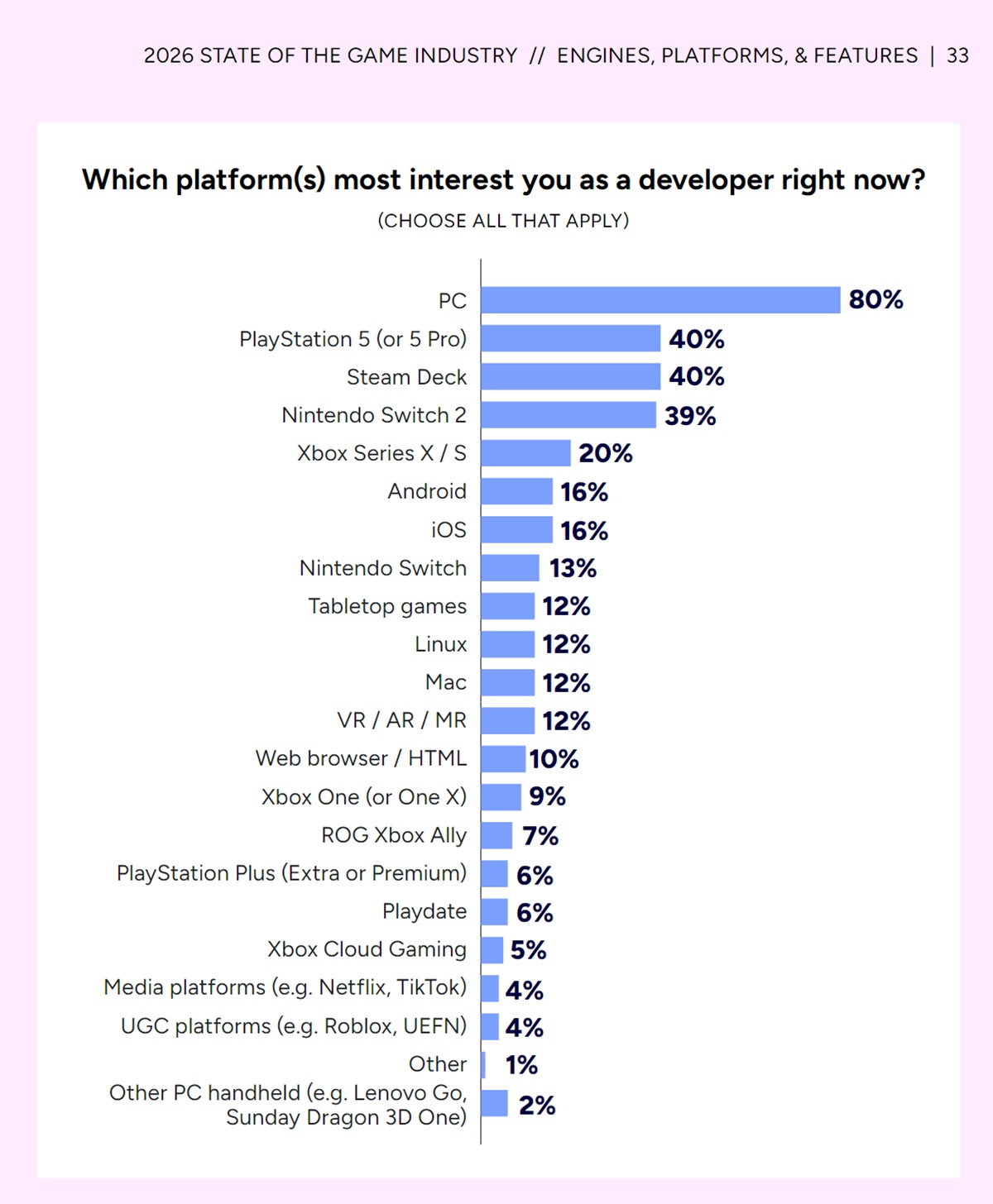 Al igual que en el informe de 2025, el juego en ordenadores de sobremesa y portátiles sigue siendo una prioridad para estos creadores. Ninguna consola individual tiene la misma base masiva de usuarios, y mercados populares como Steam tienen menos restricciones. Ese apoyo se extiende incluso al Steam Deck basado en Linux, que obtuvo un impresionante 40%.
